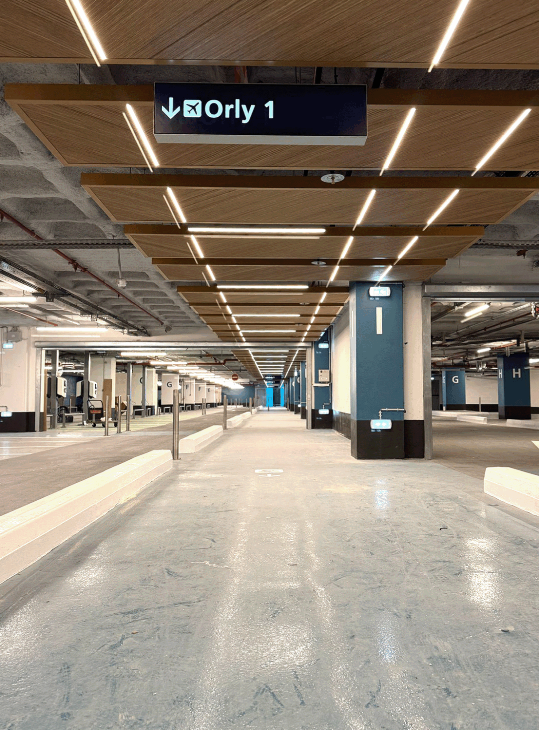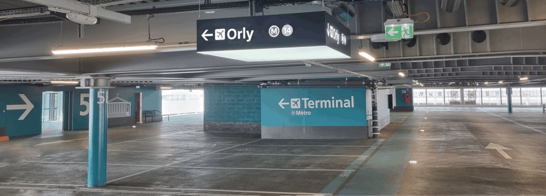 Dans les zones premiums, situées au plus près des terminaux, nous avons installé des arches ainsi que différents éléments de décor pour structurer les cheminements et identifier clairement ces secteurs. Ces secteurs ont une atmosphère différente, et un rendu plus qualitatif, en cohérence avec l’offre de services proposée par les parkings d’Orly.